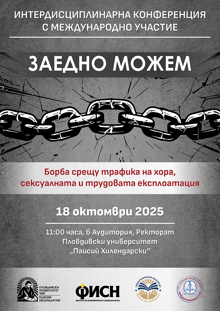 Борба срещу трафика на хора, сексуалната и трудовата експлоатация – това е темата на интердисциплинарна конференция с международно участие в ПУ „Паисий Хилендарски“ под надслов „Заедно можем“. Форумът обединява усилията на 3 факултета на висшето училище: Факултета по икономически и социални науки, Педагогическия факултет и Юридическия факултет. Поводът е Европейският ден за борба с трафика на хора 18 октомври. Затова конференцията ще се проведе именно на тази дата от 11 часа в 6 аудитория на територията на Ректората на ПУ.