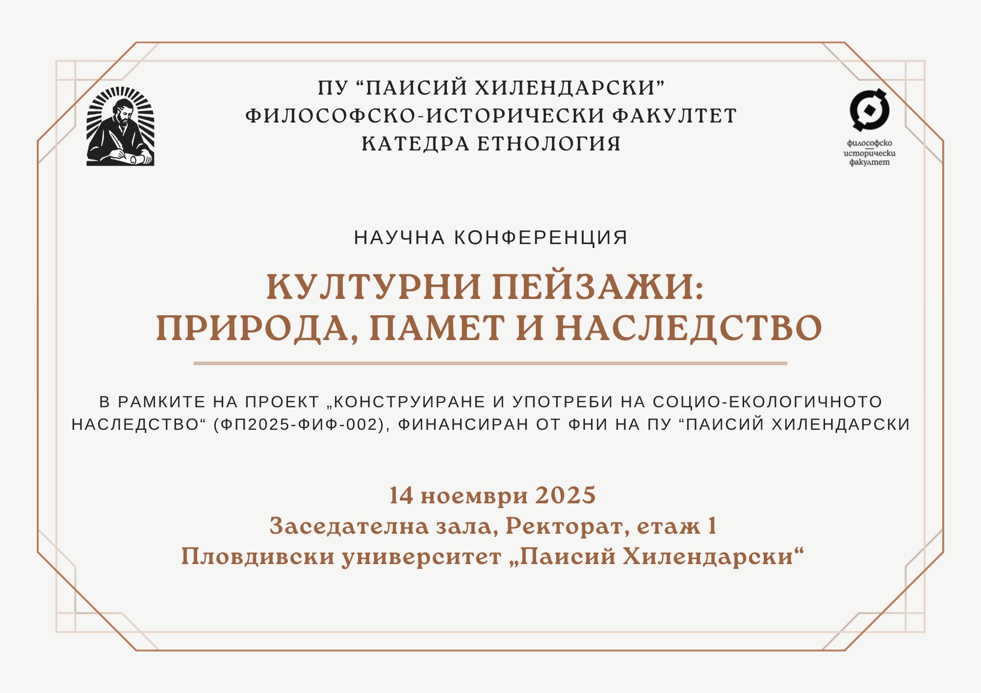 На 14 ноември 2025 г. в Заседателната зала на Пловдивския университет „Паисий Хилендарски“ ще се състои научна конференция под надслов „Културни пейзажи: природа, памет и наследство“. Форумът е част от научния проект „Конструиране и употреби на социо-екологично наследство“ с ръководител доц. д-р Елица Стоилова.