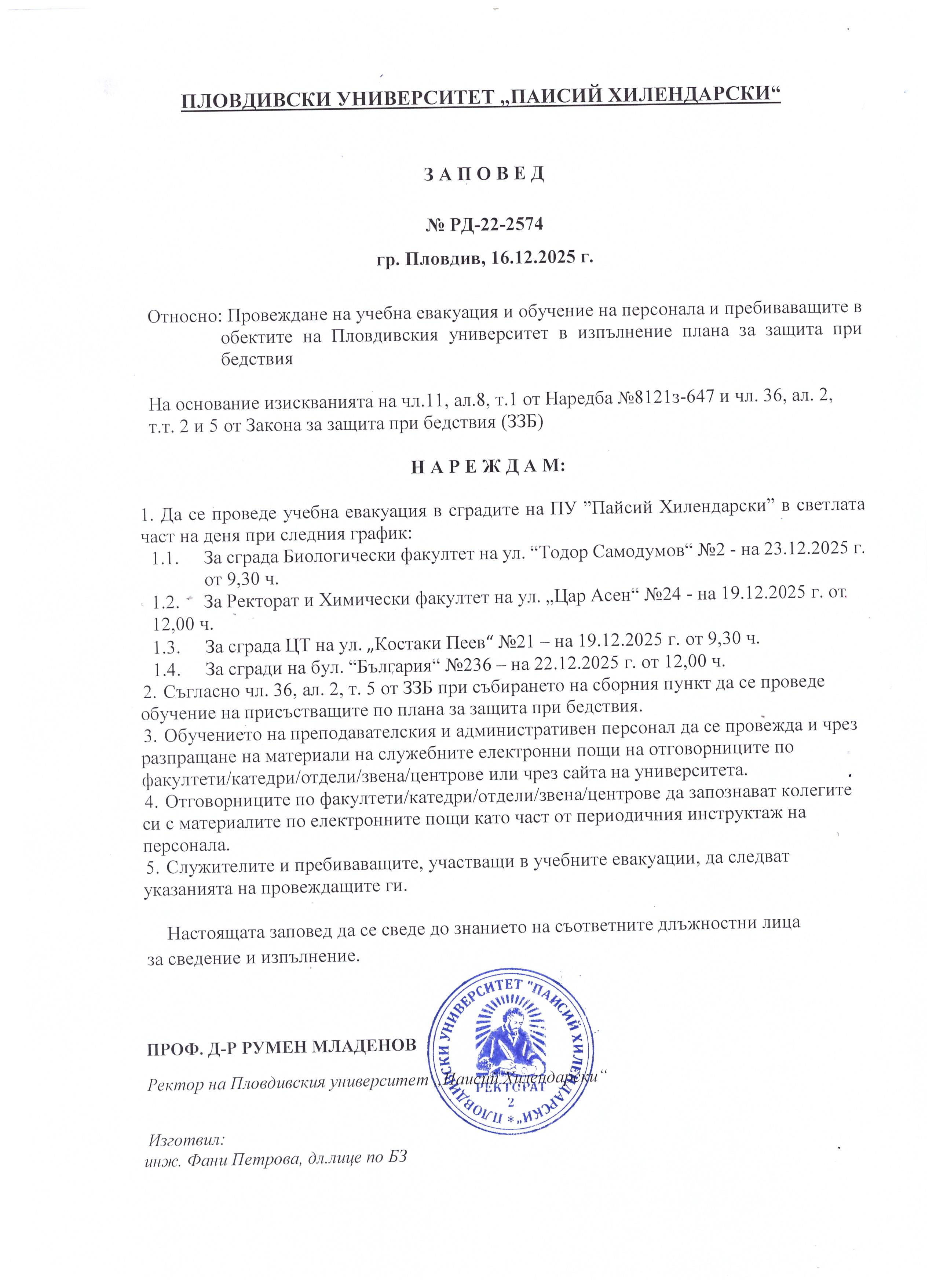 Предстои провеждане на учебна евакуация по график в заповедта. В указаните ден и час ще бъде подаден сигнал за евакуация, при което без паника, бързо и енергично всички пребиваващи в сградите да излизат навън, пред входа. Там ще се проведе и кратко обучение.