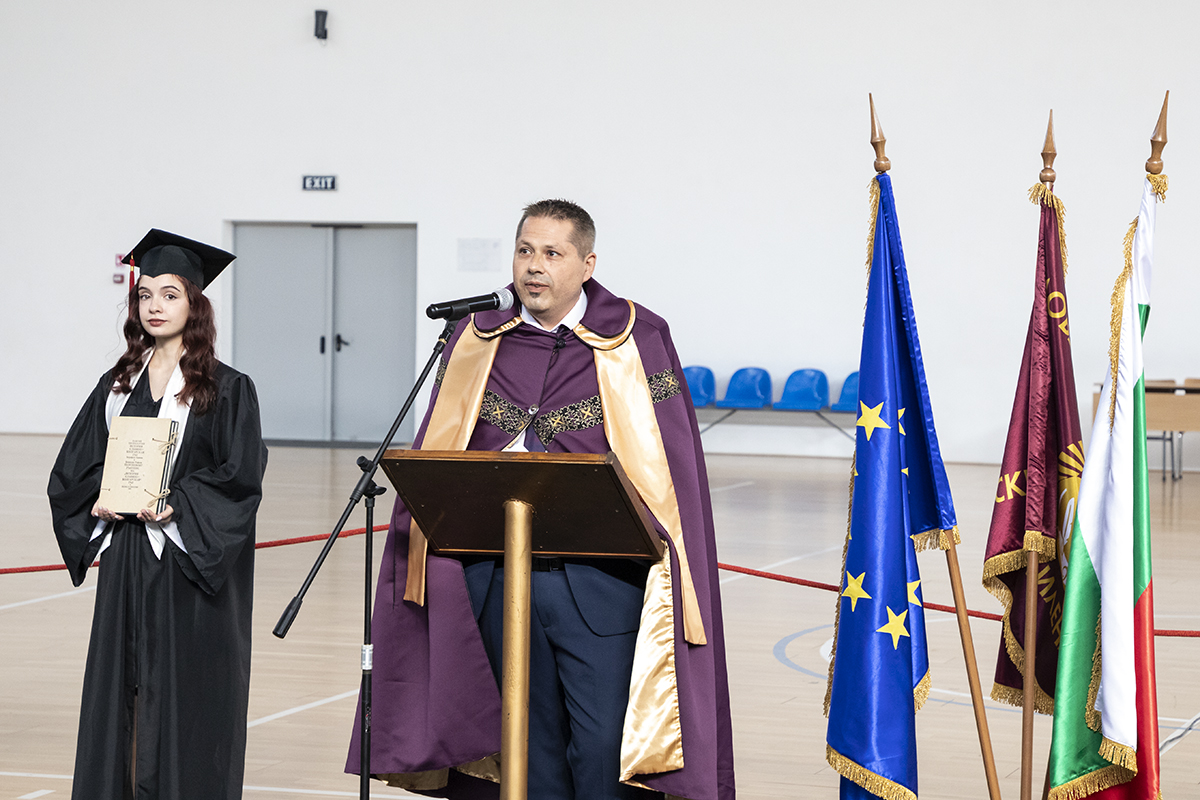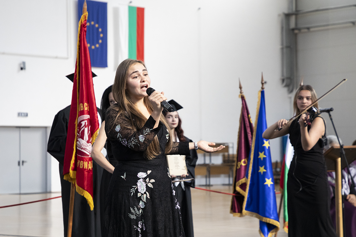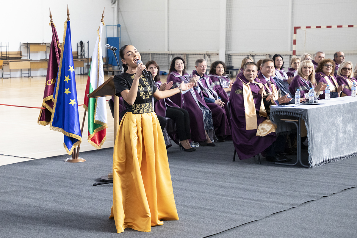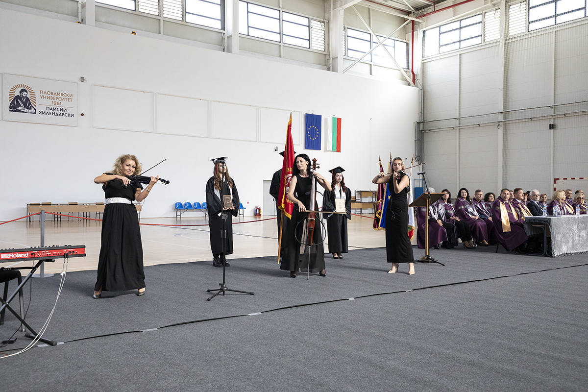 Музикални поздрави към присъстващите отправиха Петя Панева - победител в осмия сезон на "Гласът на България" и дипломиран бакалавър от ПУ, както и струнният квартет „Интро“.