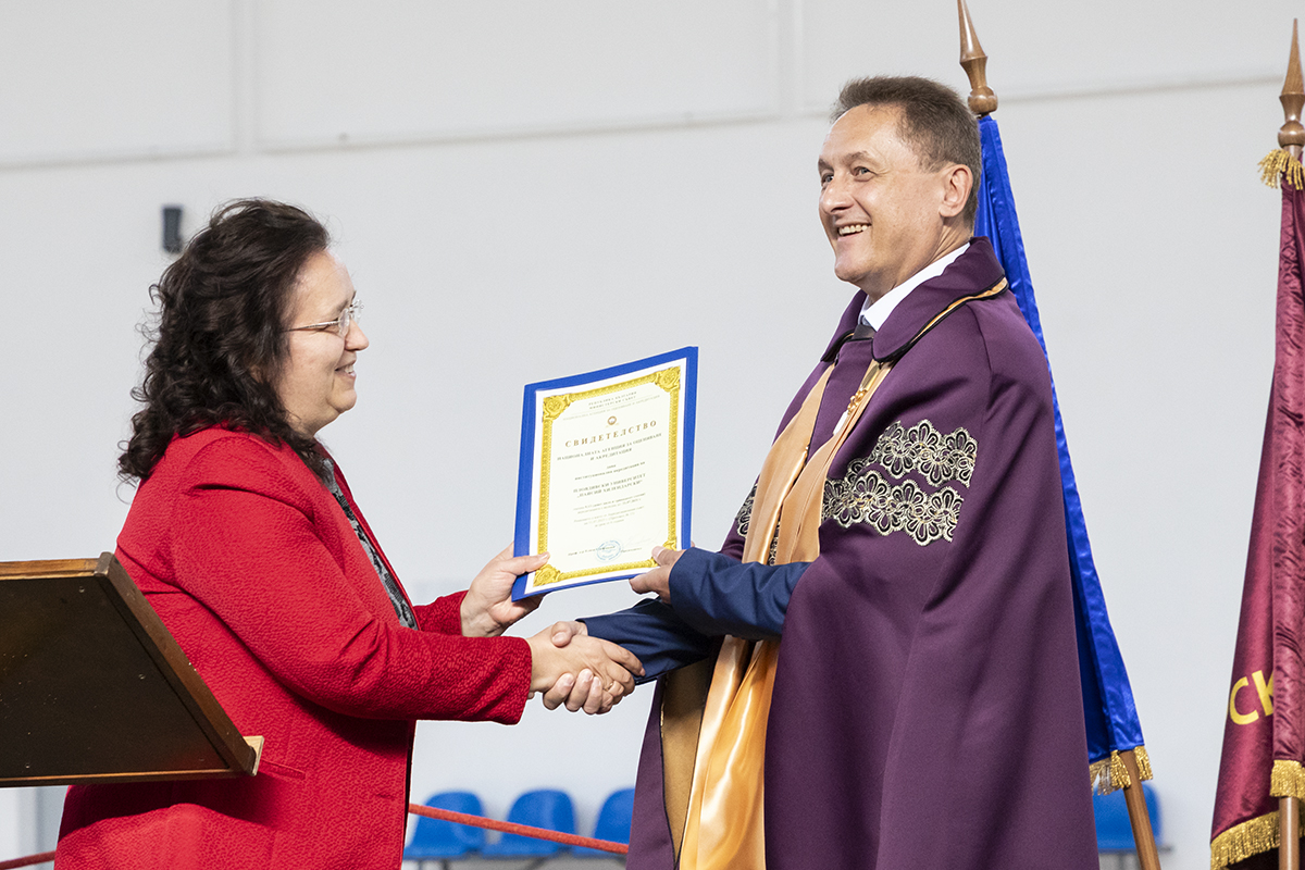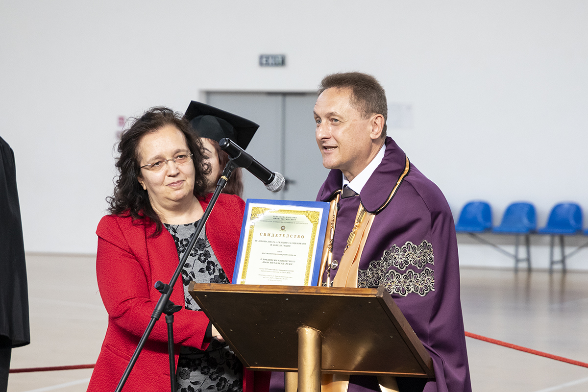 Председателят на Националната агенция за оценяване и акредитация проф. д-р Елиза Стефанова обяви, че присъства на тържеството с по-специална мисия и връчи на ректора проф. Младенов свидетелството, което НАОА дава на Пловдивския университет за качеството, което предлага.