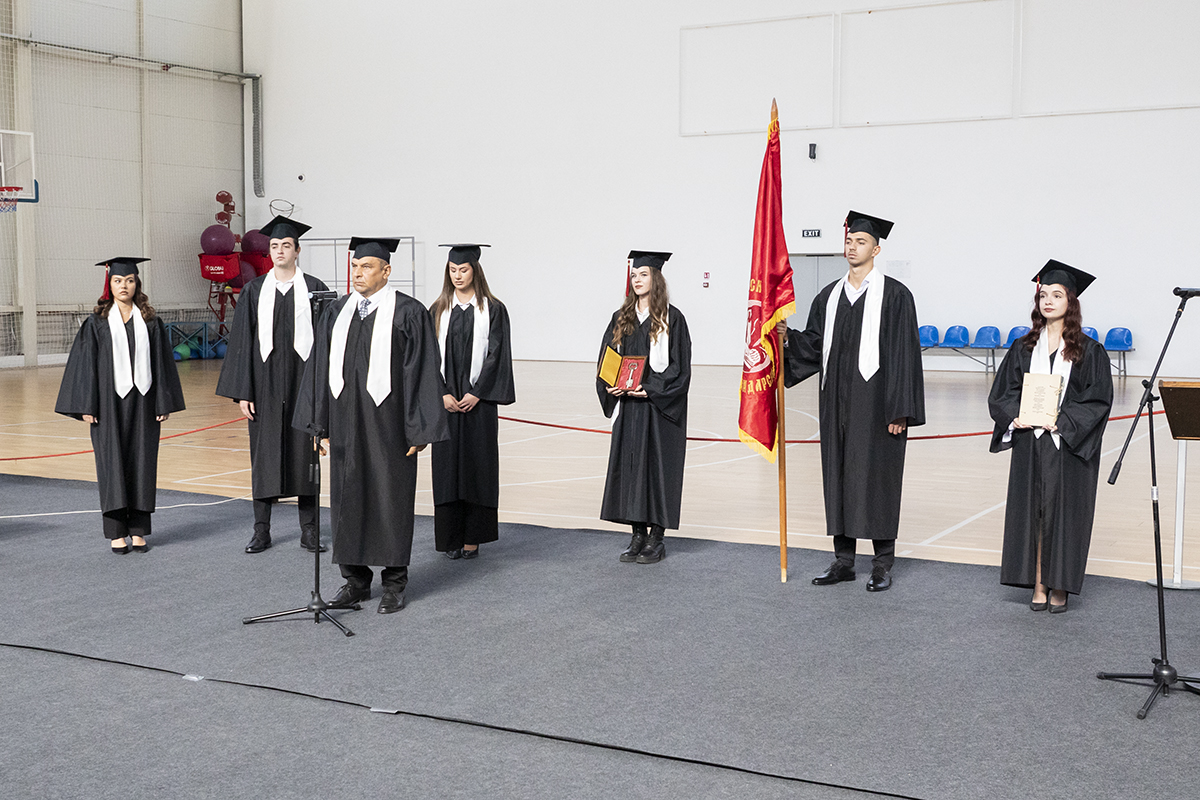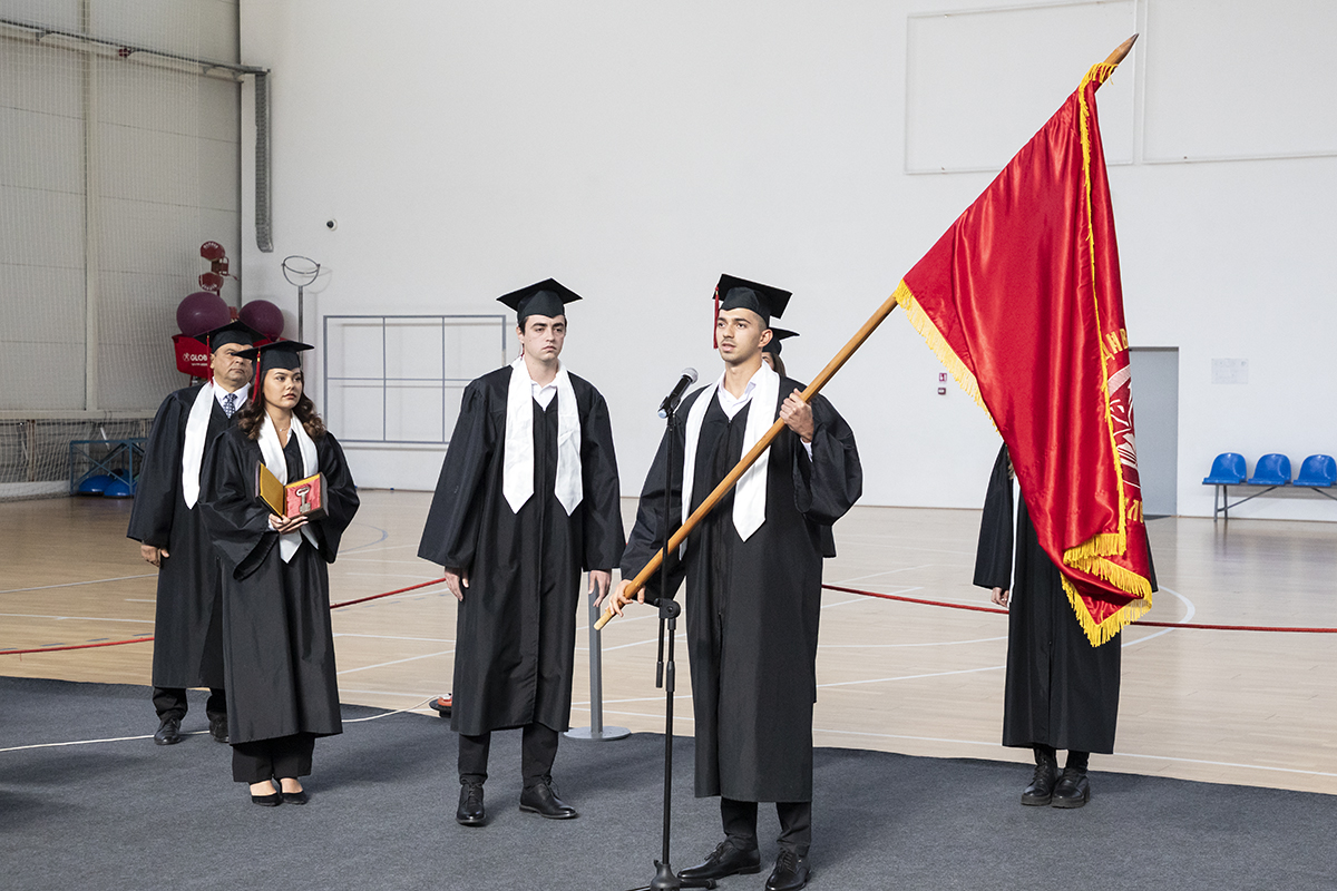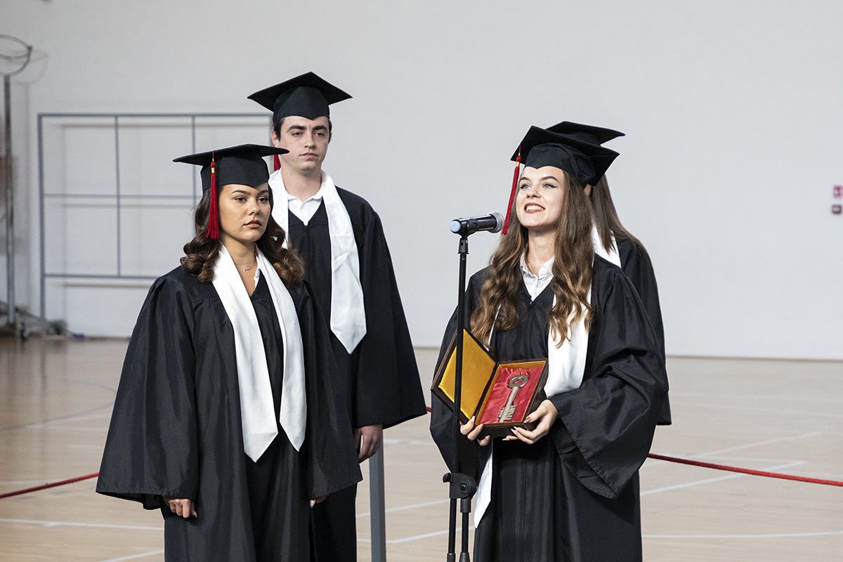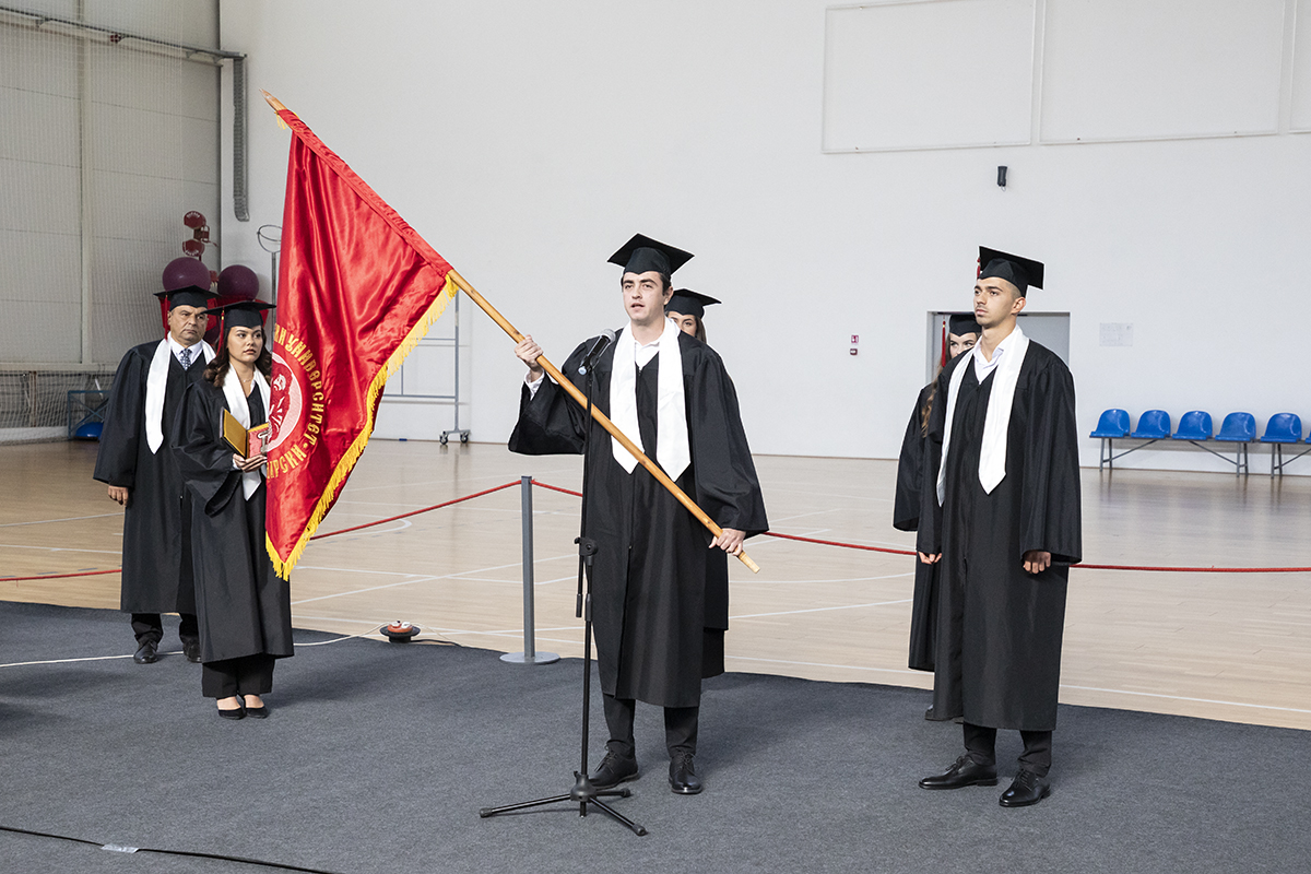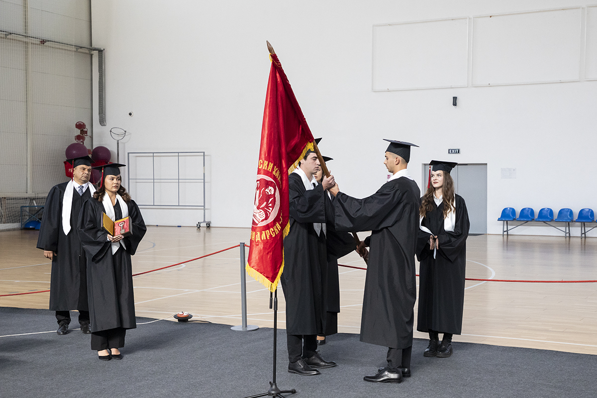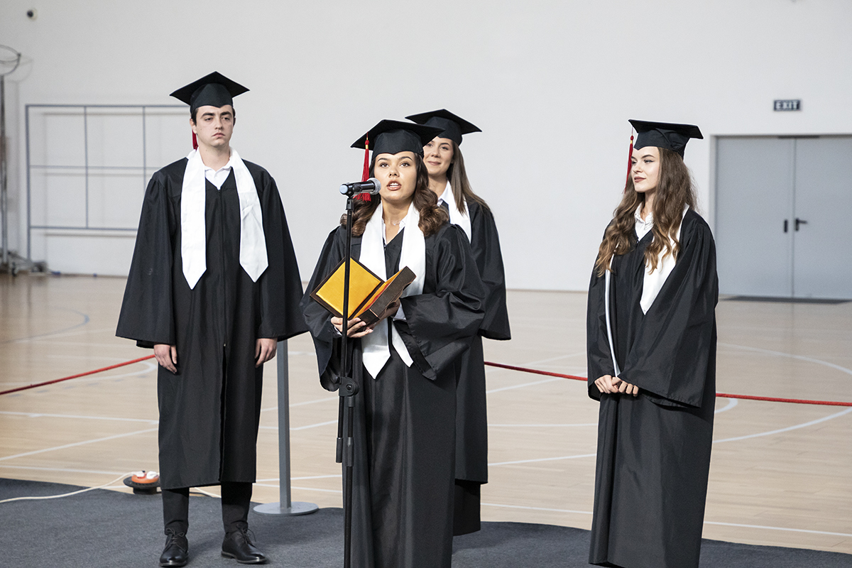 От името на първокурсниците слово произнесе Белослава Гюрова, приета в специалност Българска филология. По традиция на церемонията и тази година на първокурсниците бяха предадени университетските инсигнии – символичният ключ към университетското знание, знамето на висшето училище и копие от „История Славянобългарска“, написана от Паисий Хилендарски през далечната 1762 г.