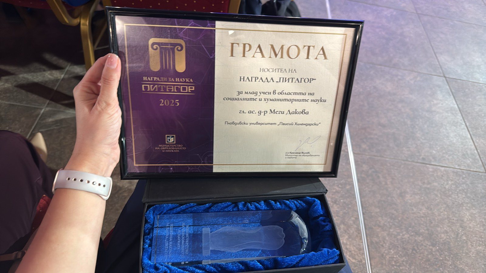 Гл. ас. д-р Меги Дакова от Пловдивския университет „Паисий Хилендарски“ спечели наградата „Питагор“ 2025 за млад учен в областта на социалните и хуманитарните науки.